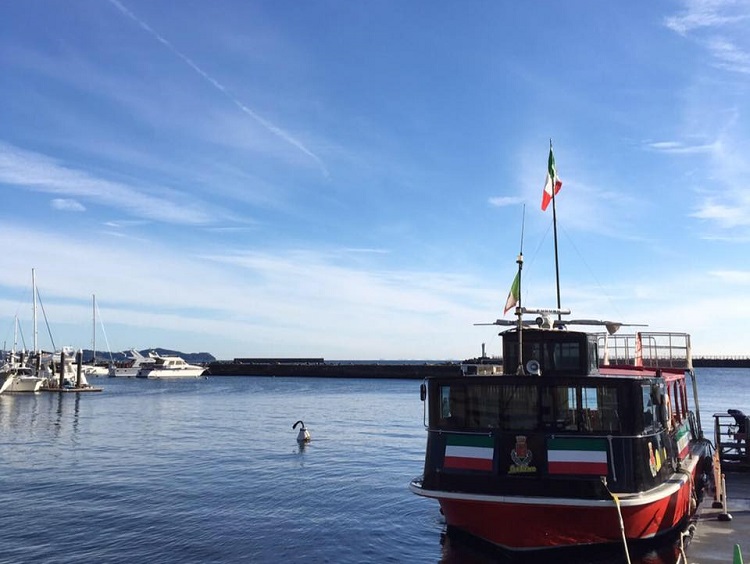 遊覧船サンレモは静岡県熱海市の港デッキから出航します。熱海市と姉妹都市のイタリアの港町
